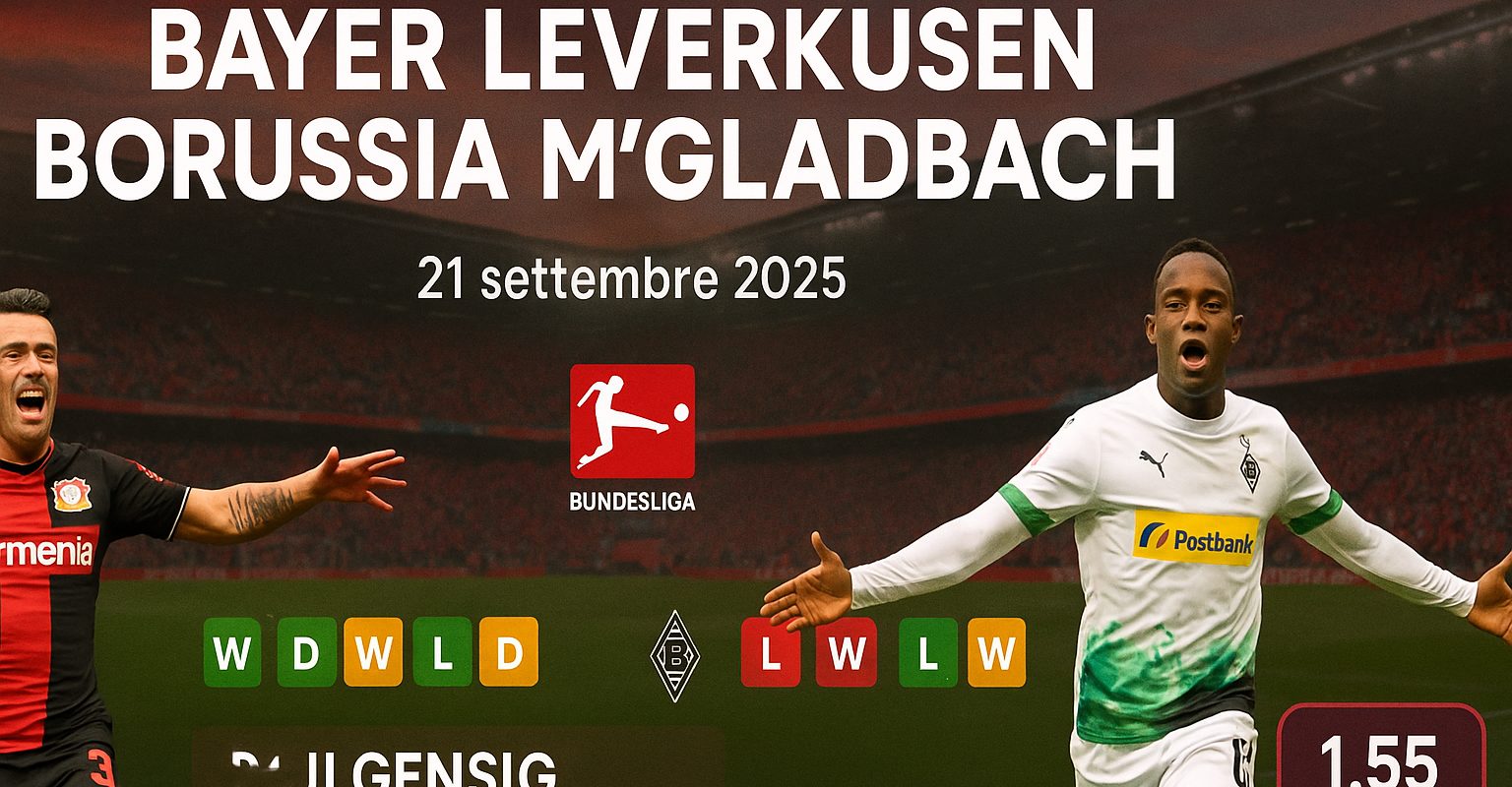 Nel seguente approfondimento analizzeremo l’incontro tra Bayer Leverkusen e Borussia Mönchengladbach, in programma per il 21 settembre 2025 alle ore 11:30. Verranno esaminati l’andamento recente delle due formazioni, i dati statistici salienti e i motivi tecnici e motivazionali che suggeriscono la vittoria del Bayer Leverkusen come scommessa razionale e profittevole. Le quote proposte dai principali bookmaker avvalorano la tesi di un successo dei padroni di casa.